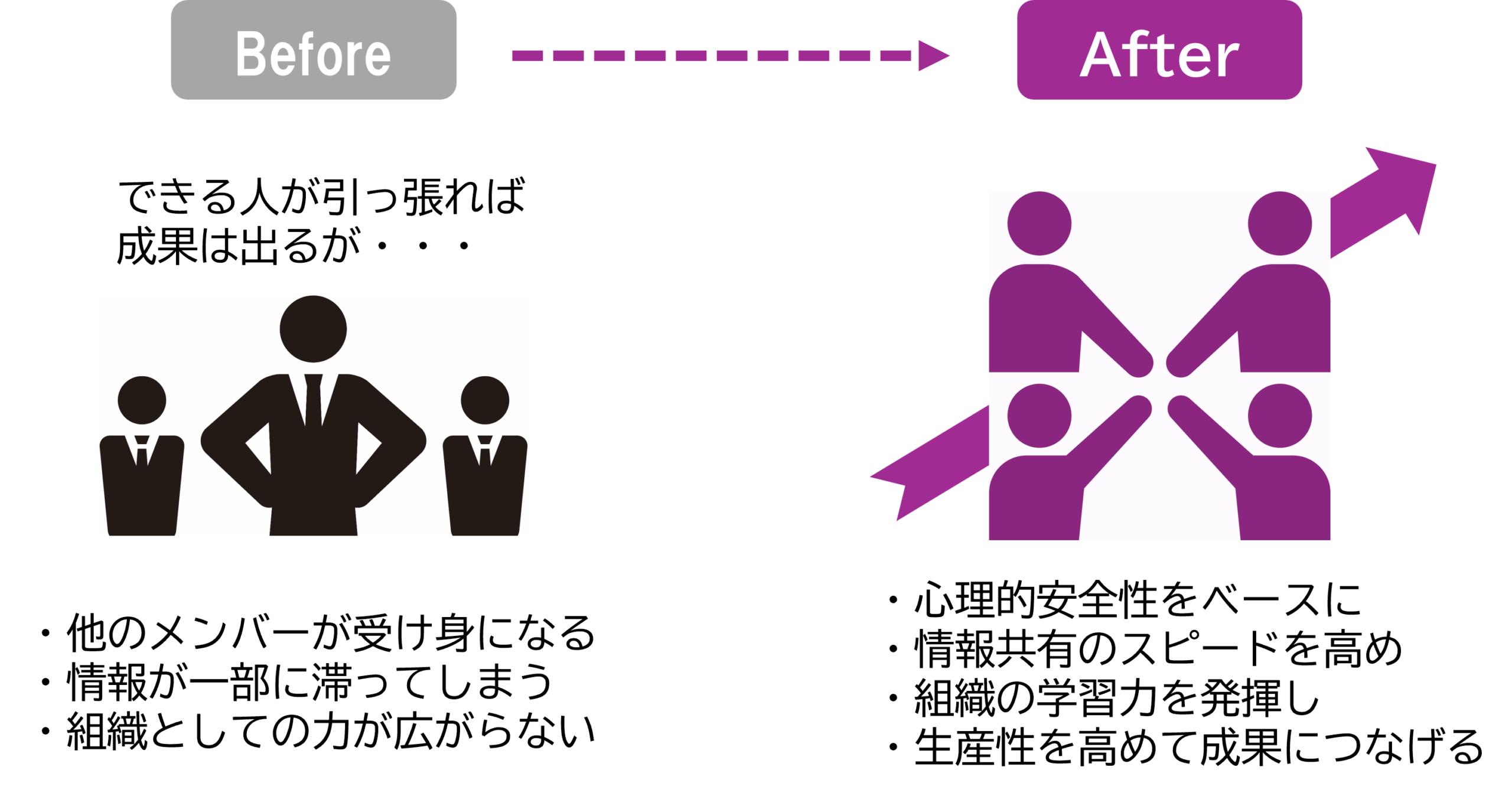 リーダー研修では、心理的安全性をベースに情報共有と組織学習を進め、生産性を高めて成果を上げる組織をつくることを軸に据えました。